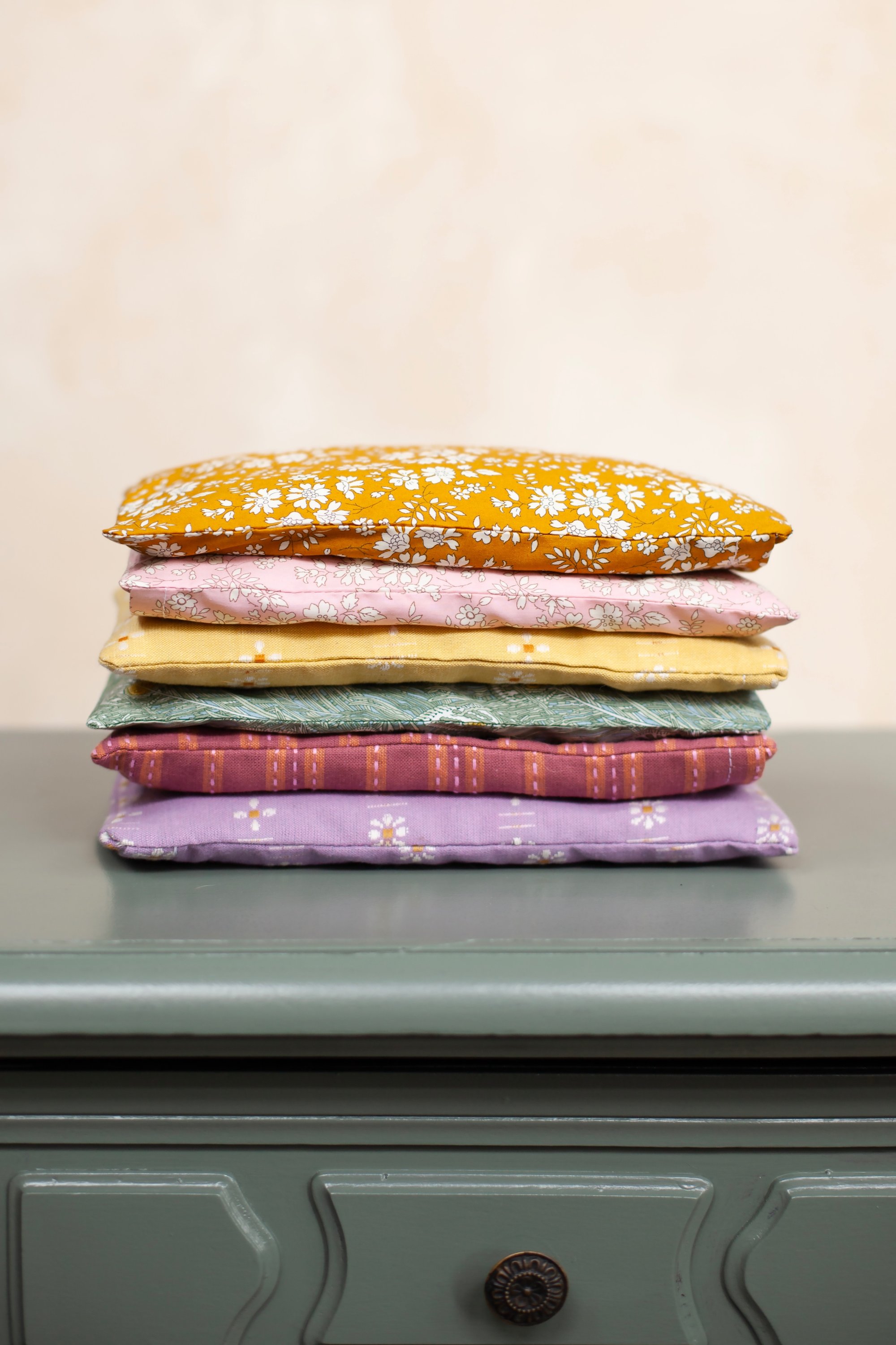 Each pillow features a removable outer cover sewn from carefully selected Liberty fabrics (designed in England, printed in Italy) or Fableism fabrics (designed in California, printed in India), and an inner pillow made from cotton filled with 100 g of lavender and flaxseeds.